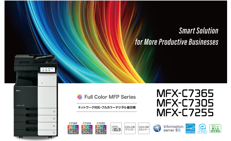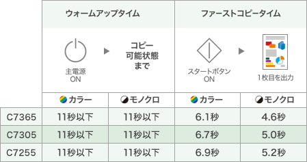 主電源ONからコピー可能状態になるまでのウォームアップタイムはカラー/モノクロ11秒以下、パネル復帰タイムは約1.2秒とクイックスタートが可能です。さらにファーストコピータイム※1は、MFX-C7365でカラー6.1秒/モノクロ4.6秒と高速スピードを実現しました。毎分コピー速度36/30/25枚という充実のラインナップから、オフィスのニーズに適した1台をお選びいただけます。