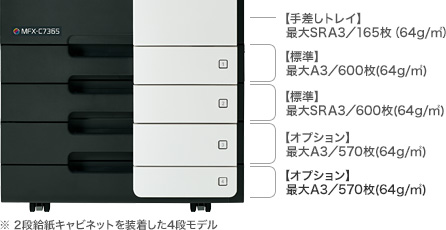 また各570枚セット可能な2段給紙キャビネットやA4用紙2,750枚セットできる「2750枚給紙キャビネット」、さらにはA4用紙3,500枚まで給紙できる「大容量給紙ユニット」など豊富な給紙オプションをご用意し、最大7,615枚の大量給紙を実現しました。