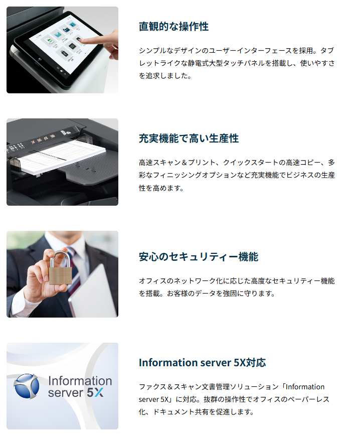 スキャンした原稿は、E-mailやネットワーク上の共有フォルダー、本体ボックス(SSD)、FTP/WebDAVサーバー、USBメモリーなど様々な宛先に送信・保存でき、情報共有を簡単&スピーディに実現します。