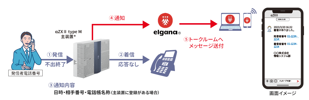 ビジネスフォンへ外線着信を受け未応対だった場合、指定したelgana®のトークルームにメッセージを送信。