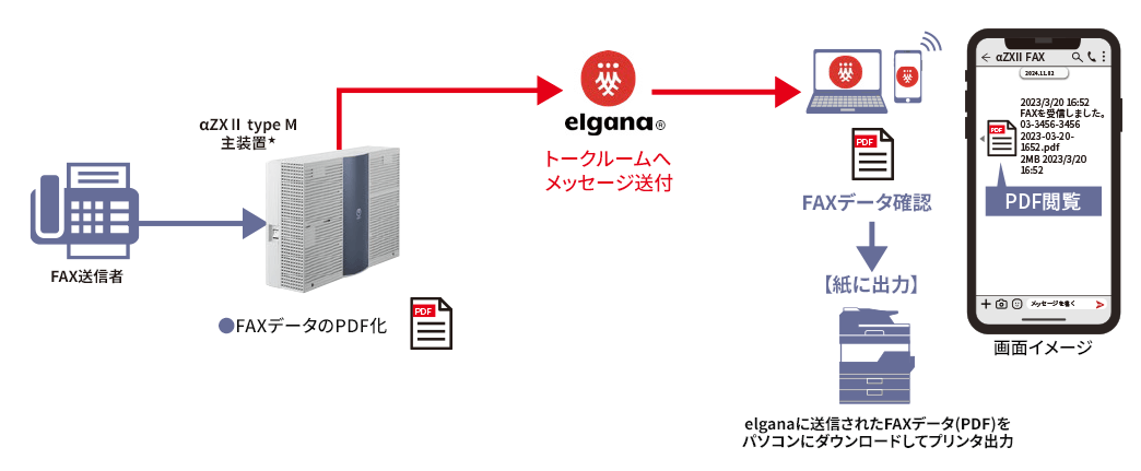 会社のFAX機ではなく主装置内の仮想FAXで受信しトークルームにPDFで送信。外出先でも閲覧ができFAX番号を増やすことで個人毎でFAX受信をすることも可能です。